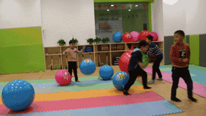 4.大笼球游戏:由父母亲协助孩子坐或趴在大笼球上,趴在上面,抓住两脚,保持平衡,躺在上面或坐在上面,用大笼球压过孩子的身体,这样对孩子触觉学习及身体形象强化有很大帮助。