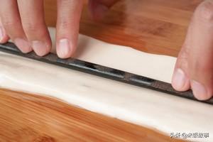 4.用擀面杖擀成牛舌型或者长方形,稍微擀薄些,再用筷子在面皮中间压一下。