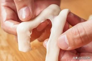 5.双手分别抓住面皮两头,顺着筷子印记的方向将面皮一点点轻摔抖长。注意,拉长后的面皮中间可能会比两头厚,所以拉伸至两头厚度适中后,要额外将中间再稍微拉伸一下。