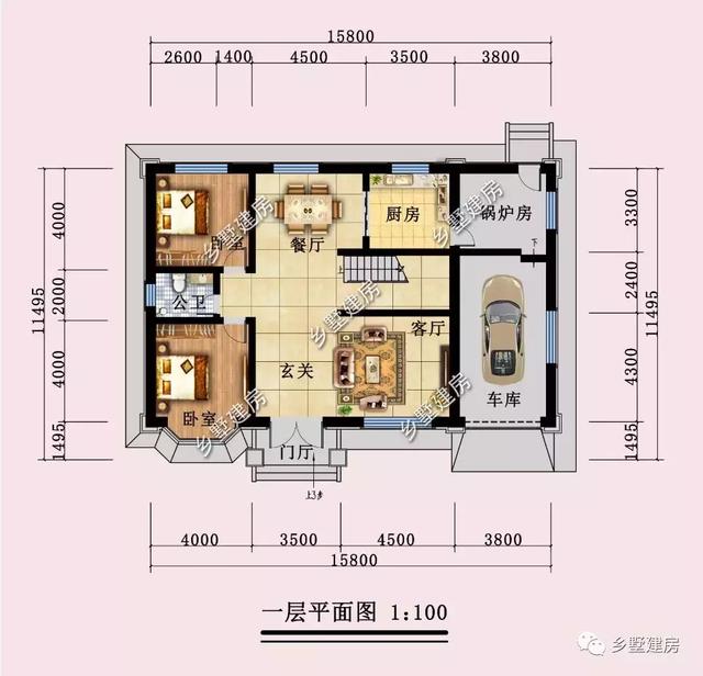 别墅一层平面图:设有门厅、玄关、卧室、卫生间、餐厅、厨房、客厅、锅炉房、车库。
