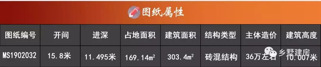 别墅基本信息:开间15.8米,进深11.495米,占地面积169.14平方米,建筑面积303.4平方米,主体砖混结构,造价36万左右,建筑高度10.007米。