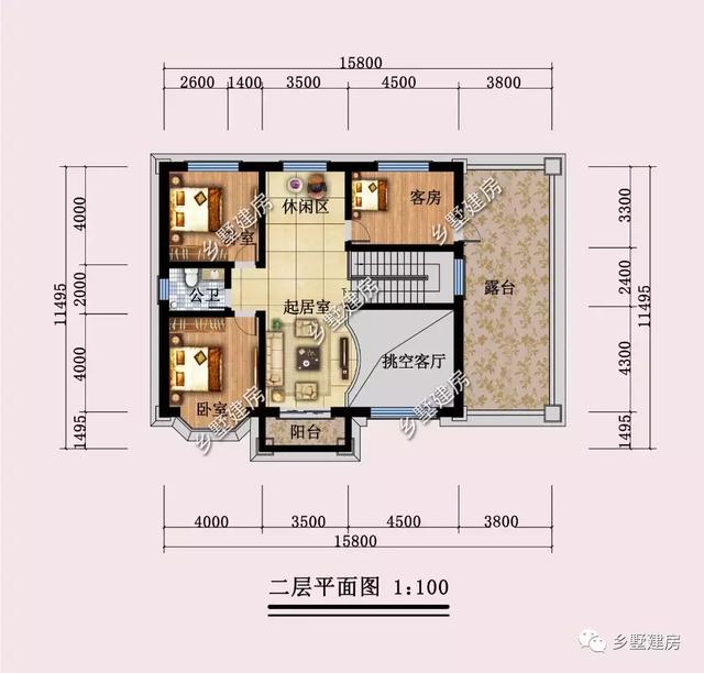 二层在一层对于的位置设计了两间卧室,南向卧室采光通风优,可作用主人房,北向卧室作为儿童房;客房设计在楼梯口;休闲室方便家人饭后娱乐休闲;大露台种植花草,摆上桌椅,静听花开花落,坐看云卷云舒,生活好不惬意。2019-10-03 14:01:37 -