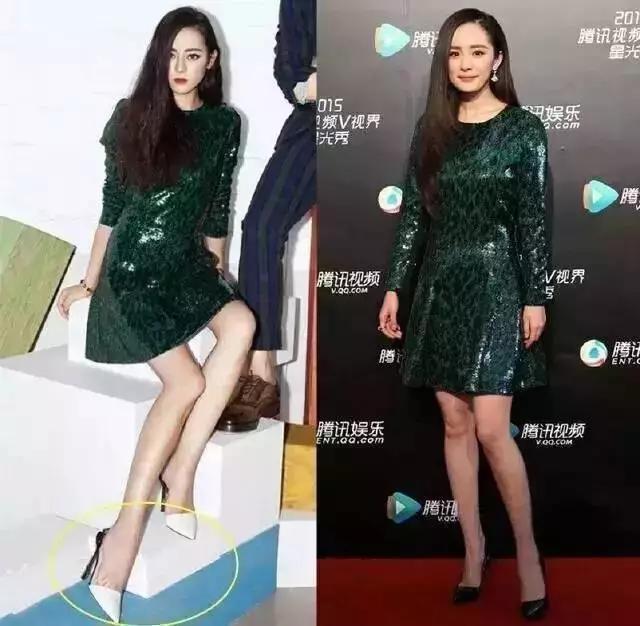 两人同穿墨绿色短款连衣裙,迪丽热巴搭配尖头白色高跟鞋,接近皮肤颜色是不是感觉腿长两米呢。而杨幂搭了双黑色高跟鞋,反而盖住了腿的优势,显得整体比较暗沉老气。
