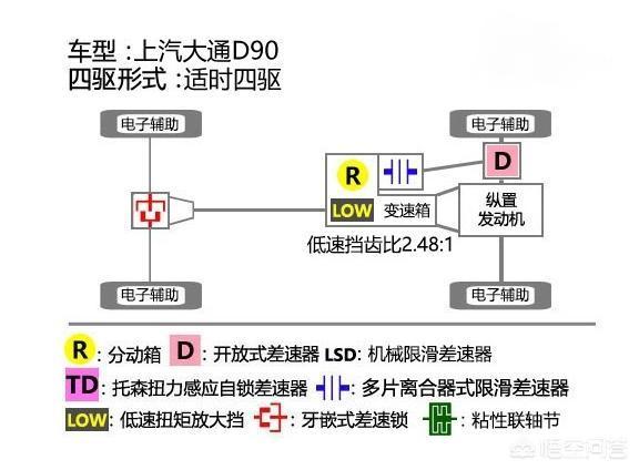 大通D90的全时四驱则不同,前桥多出主动限滑差速器,后桥升级为牙嵌式差速锁,这种锁可以通过驾驶员控制锁止或闭合,不需要车辆判断是否需要锁止,人工干预驾驶的可靠性在车上还是比电脑可靠的,前轮轮间限滑能力也要比荣威rx8更强。