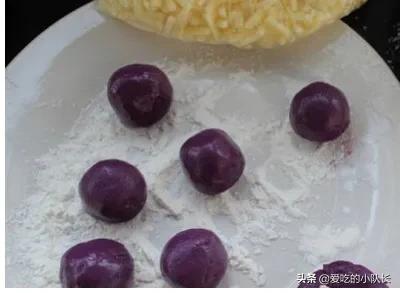 将紫薯泥捏成薯薯,可以在薯球里加一点白糖,这样更好吃!