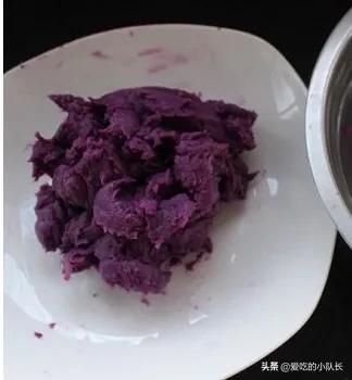 首先将紫薯蒸熟,用勺将紫薯压成紫薯泥,也可以用料理机将紫薯打成紫薯泥。
