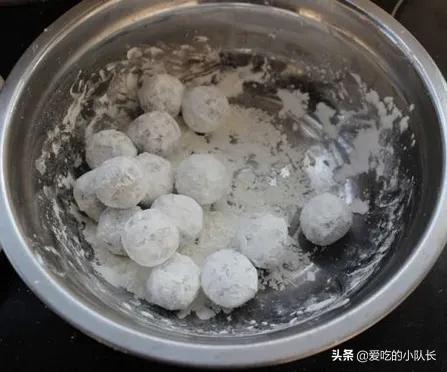 4、锅内倒入丸子,快速翻伴,盛到盘子中,拿起一个丸子快速拨丝。