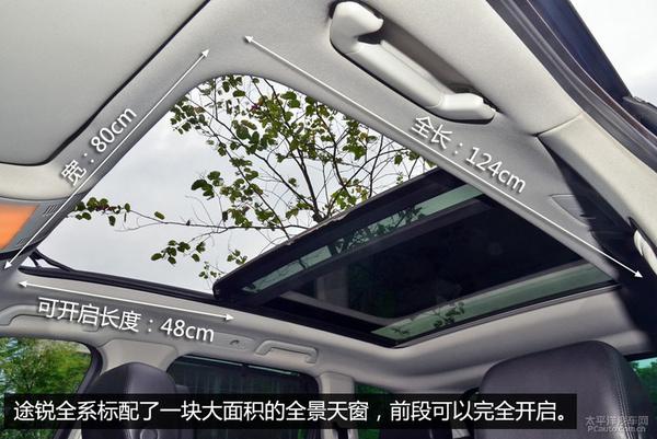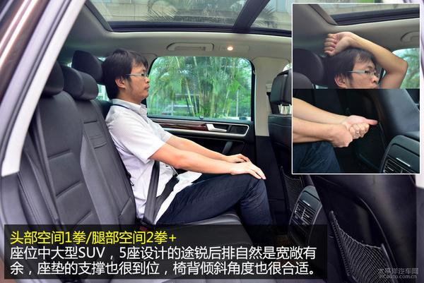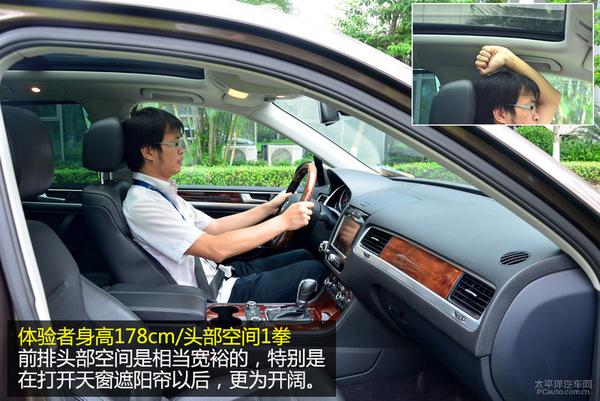 在途锐的车内,你会觉得十分开阔,这一方面是它宽大的车身提供的基本空间是足够的,另一方面则来自于那块全景天窗的设计,它从驾驶员头顶一直延伸到后排乘客头顶,给人带来了十分棒的体验。