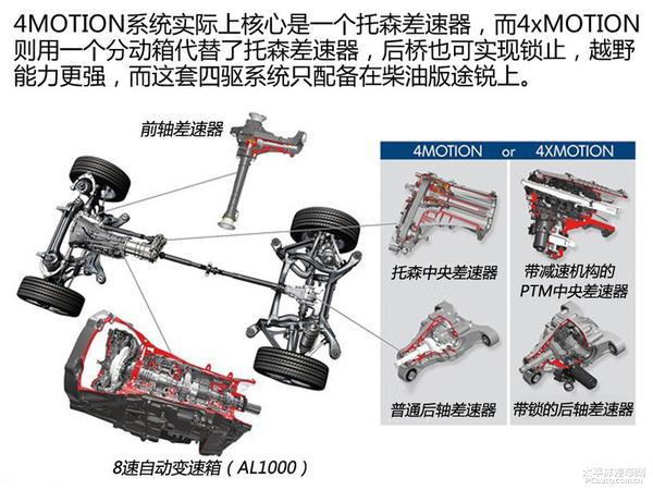 途锐的汽油版车型配备了一套4MOTION系统,其采用机械式的托森差速器,实际上与奥迪的quattro系统结构相同。托森差速器可以完全通过机械结构完成扭矩分配,在车轮悬空或者在光滑路面出现打滑时,迅速锁止,将扭矩分配给具有附着力的车轮,正常情况下前后轴保持40:60的动力分配,而极端情况时后轮最大可以分配到80%的驱动力,前轮最大能够获得60%的驱动力。