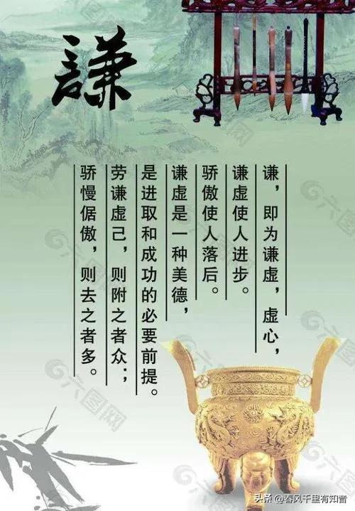 1.谦谦君子,卑以自牧。(《易经》)释义:即使处于卑微的地位,也能以谦虚的态度约束自我;而不因为位卑,就在品德方面放松修养。