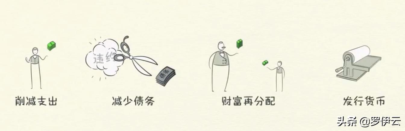 而到收入没有办法支付利息的时候,就会出现债务违约,作为国家来说货币只是一个管理交易的工具,如果不够可以提高货币供应量,俗称印钱。那印钱的直接后果就是同伙膨胀。简单讲,假设市面总共流通1000块钱,这哥们煮一碗白酒烧肉买菜加油盐酱醋一共就10块钱。如果印钱,那么货币供应量就提高了,市面流通了2000块钱,那么这哥们的一碗肉就是20块钱,这样同样干这份活表面上看好像可以收入更多,但是这哥们拿着这钱取买其他东西的费用也增加了,这样利息偿还压力可能就更大。因此,钱就不能乱印。根据,经济机器理论要做到债务稳定消除或者稳定去杠杆那就要做到以下几点: