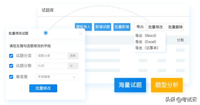 创建试题分类管理考试试题。单选、多选、判断、填空和问答题,能使用模板导入或批量新增试题的方式,一键大量添加;除此之外,包括组合题等比较复杂的试题,能使用单个新增试题的方式导入,可以在编辑器模式下添加图片、音频、视频等内容。