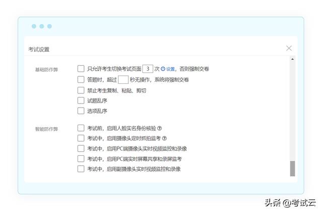 - 基础防作弊:防切屏、规定时间无操作交卷、禁止考生复制粘贴剪切、试题乱序、选项乱序。