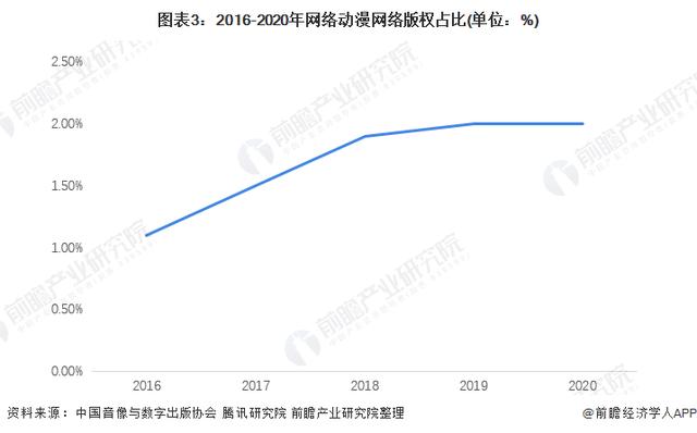 从网络版权结构来看,网络动漫版权占比由2016年的1.1%提高至2020年的2.0%,增加0.9个百分比,增长幅度仅次于短视频、直播和网络新闻媒体领域。