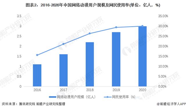 互联网的快速普及成为文娱产业发展的有力推手,动漫产业也不例外。动漫内容在社交媒体上讨论声量大涨,成为网民,尤其是年轻网民的热门话题,拉动了动漫用户稳定增长。根据国家版权局和腾讯研究院联合发布的《中国网络版权产业发展报告》,2020年,中国网络动漫用户规模达到2.97亿人,同比增长11.7%,相比2016年增加160.53%,网民使用率达30%。