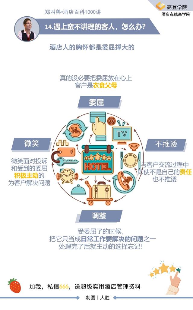 酒店遇到一些顾客不讲理怎么办? spider 更新于 2023-07-24 06:26:05 全部 1029 酒店遇到一些顾客不讲理怎么办? 回复 共1条回复 我来回复 郑叫兽高登科技 这个人很懒,什么都没有留下~ 评论 遇上蛮不讲理的客人,怎么办?酒店人的胸怀都是委屈撑大的真的没必要把委屈放在心上。客户是衣食父母受委屈了的时候,把它只当成日常工作要解决的问题之一,处理完了后就主动的选择忘记!大家好,我是“酒店郑叫兽”获取更多酒店知识请关注我。 赞同 2023-07-15 13:54:17 0条评论 请 登录 或者 注册 后回复。