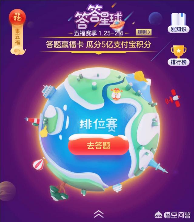 方法四:进入支付宝主页面的"天天向上,过福年",选择"答答星球",进行答题,答对题目每天可以获得一张福卡