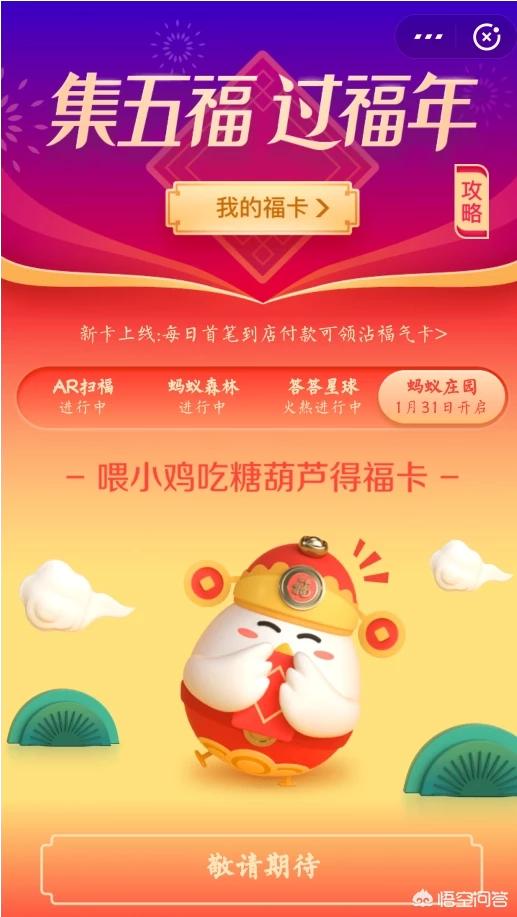 方法五:进入支付宝蚂蚁庄园,喂小鸡吃糖葫芦就可以获得福卡,这个活动在1.31日开始。