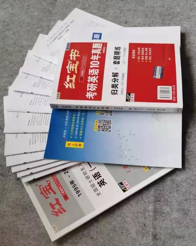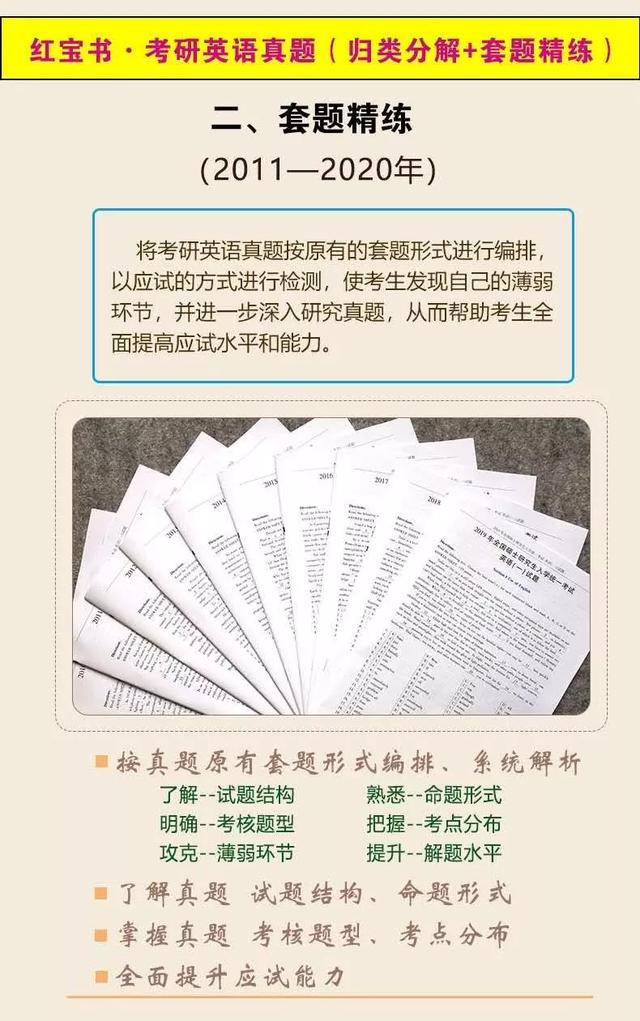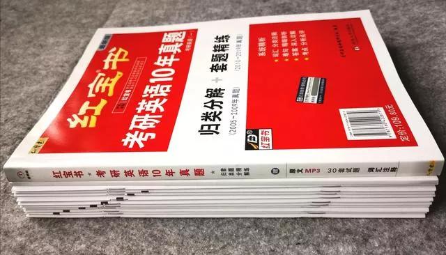 - 《红宝书考研英语10年真题》 遵循由简单到复杂、从局部到整体的原则,先分类突破,再整合提高。里面对于 长难句 和 语法 解析的很全面,也很到位。是一个非常严谨的资料,尤其是设计相当合理。通过科学、合理、高效地使用真题,全面提升应试能力。