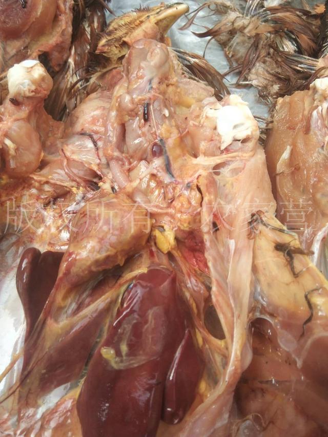 临床剖检可见:病死鸡冠紫,口腔充满粘液,气囊混浊,有大量混浊的纤维素性渗出液。严重的气囊炎可见气囊壁增厚,有大小不等的黄白色到黄色干酪样渗出物,肺脏充血、出血,喉头出血,气管出血严重。有的病死鸡出现心包炎、肝周炎,腹膜炎等症状。腺胃乳头无明显变化,肌胃无变化,整个肠道充血、黏膜脱落,肾肿(间质出血)。