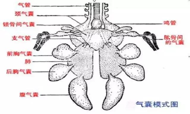 气囊是禽类特有的器官,鸡体内有9个气囊,这些气囊由支气管分支出肺后形成,大部分与骨骼的内腔相通,使骨骼成为含气骨。因此,可以把气囊理解成肺脏的延伸部分。气囊除了辅助呼吸以外,还可以起到飞翔过程中的平衡作用。