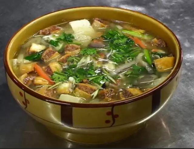 中卫素杂烩,又称烩小吃。烩小吃是一道传统著名小吃,宁夏各地均有制作。形状相似的夹板子、豆腐、粉条、面筋、菠菜,丸子,再加上清莹的汤,总让人忍不住多喝几碗。