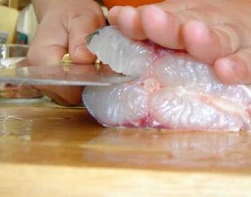 做鱼片讲究把鱼肉切成薄片,在切成鱼片的时候要注意不能太厚,也不要太薄,太厚,做出来不嫩,太薄,容易做碎、煮烂。