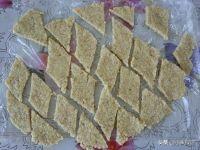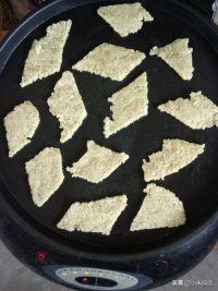 - 在案板上面撒上一些面粉,这样能够防止面粉粘在面板上面,然后把小米从碗里面倒出来,用擀面杖擀成片状,然后切成锅巴片。之后用不粘锅来煎制锅巴片,在煎制锅巴片的过程当中,锅巴片有可能会卷曲,所以在煎的时候应该要用铲子按压,就能避免这个问题出现。