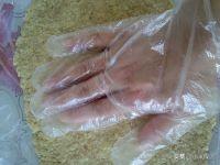 把拌好的饭倒在菜板上,用平点的饭勺使劲压,把饭的粘性压出来。(温馨提示:用饭勺时间长些,如果想要快些压好,就戴上一次性手套,像揉面团一样,把饭揉出粘性,这个很快,就3分钟左右OK了。也不要压得太细,有粘性,但又看得到饭粒就好了。)