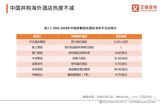 2016年中国酒店资本开始“走出去”,酒店行业的跨国并购持续上演:开元酒店集团以2.2亿元人民币的价格收购荷兰埃因霍温市的假日酒店、安邦保险以65亿美元收购美国奢侈酒店、中资集团以21亿加元收购加拿大酒店等。