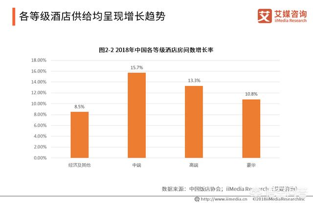 2018年中国酒店供给整体呈现增长趋势,酒店整体供给的房间增长率达到了10.2%。随着消费者对住宿环境要求的上升,中端型酒店的房间供给增长迅速,增长率位居各档次酒店首位,达到15.7%。