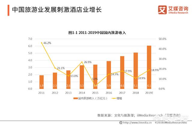 随着人民生活水平的提升,我国旅游业出现快速发展,酒店业作为旅游行业的一个重要子行业,需求也随之不断增长。2011-2018年中国国内旅游收入保持增长,2018年中国国内旅游收入达到了5.1万亿元,预计2019年达到6.1万亿元。2018年1至6月份酒店业务增长稳健,据专家分析,在以后几年之间,中国酒店业投资将达3400亿元。