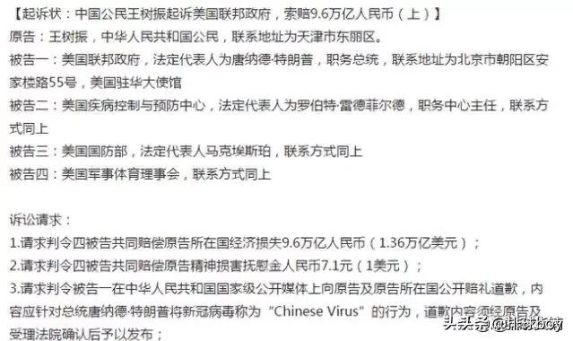 在这个时候中国南开大学的一位老师站了出来,起诉美国联邦政府、美国疾病控制与预防中心、美国国防部以及美国军事体育理事会,要求他们赔偿9.6万亿人民币!