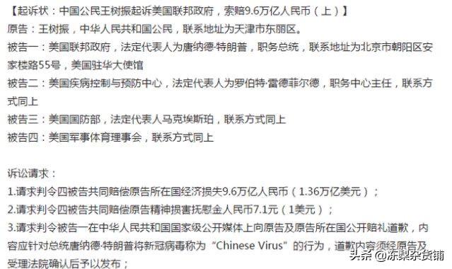 面对美国这样的做法,我国民众也纷纷做出了反击。近来,南开大学的英语教师王振树,将美国总统和国防部告上法庭,提出向美国索赔9.6万亿元请求。我们对王振树教师的诉讼请求进行了梳理: