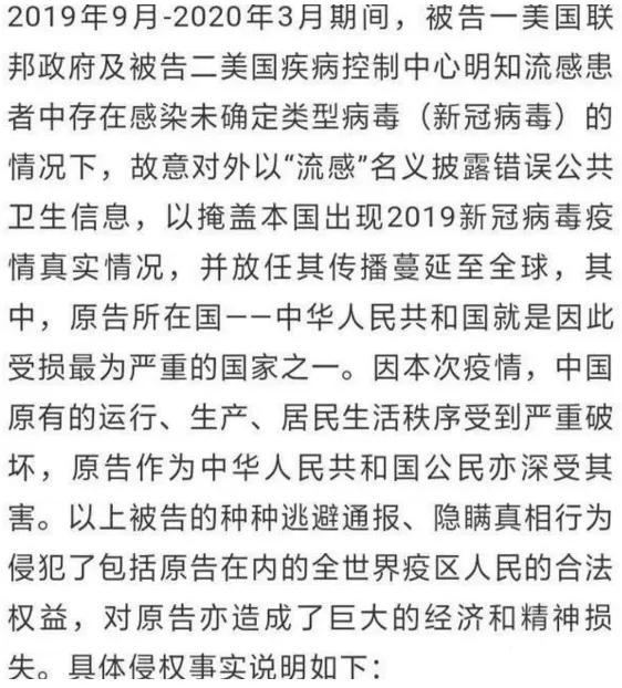 我们来看一下王老师的一个索赔理由,大概总结就是美国在国际舞台上用疫情的原因抹黑中国并且给中国经济带来了一个巨大的损失,还有就是病毒的源头可能就是来源于美国。