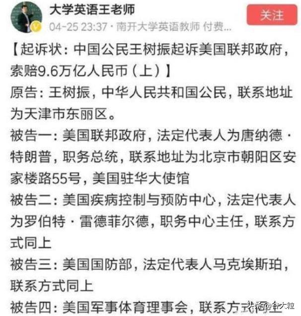 南开大学的英语老师王树振,就向美国发起9.6万亿赔偿的诉讼!