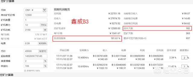 石乘的鑫威B3矿机功率是2150W,每天可以挖0.0023-0.0025个比特币,如下图:鑫威B3的价格是12500元整。