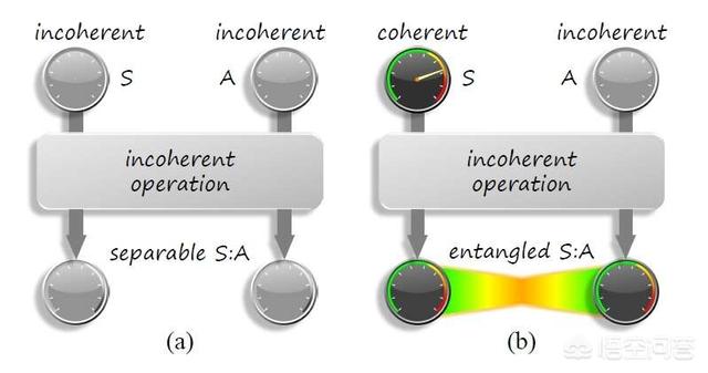 2015年的一篇发表在物理学顶级期刊Physical Review Letter上的论文更细致地分析了这个过程【Phys. Rev. Lett. 115, 020403 (2015)】:如图,左边S和A可以看成两个经典的不具有量子相干性的系统,任何经典的操作(incoherent operation)都另它们可以分离。右边为一个量子相干态,即叠加态,A为一个经典的系统,一个经典的操作就可以让两个系统纠缠起来。