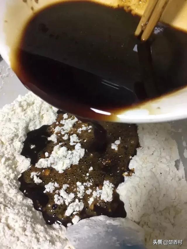 步骤二:把酵母倒入红糖水中,静置两分钟等酵母自动融化,把泡打粉倒入面粉搅拌均匀,先打入鸡蛋,搅拌均匀后一次性倒入红糖酵母水。