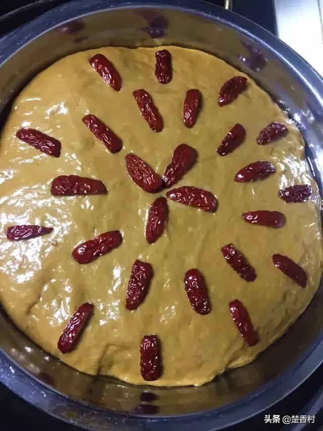 步骤五:等面糊体积变成容器的七分满时,将准备好的红枣摆在面糊表面,冷水上锅大火蒸半小时,关火后不要立即开锅,三分钟后再取出,可以有效防止发糕遇冷回缩。
