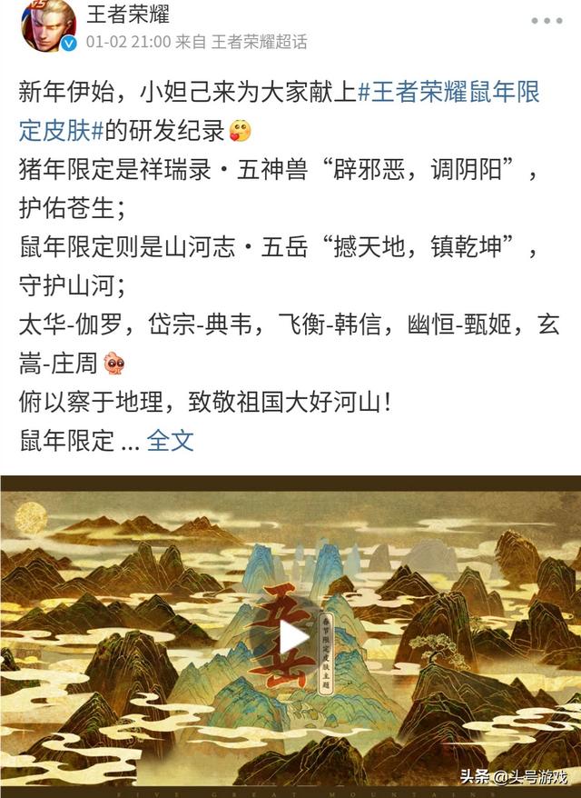 今天我要给大家说的就是关于王者荣耀鼠年限定皮肤的事情,最近王者荣耀官方也是提前的,爆料了关于鼠年限定皮肤幕后制作的事情,通过这个王者荣耀官方发布的视频,从中也看到了五岳皮肤的样子,但是这些皮肤曝光之后,有些网友觉得今年的皮肤感觉不怎么样,我们来看一下。