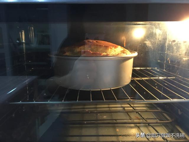 5.拌好的面糊从十厘米处倒入模具放入预热好的烤箱中下层,烤55分钟