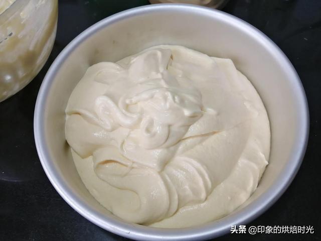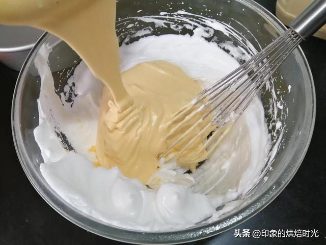 6,现在打发蛋白,蛋白打发至有密集大气泡时加入细砂糖,细砂糖分三次加入打发至提起打蛋器呈小尖角状。取一勺跟拌好的面糊拌拌均匀后倒入蛋白盆中,轻轻翻拌均匀,倒入八寸阳极模具