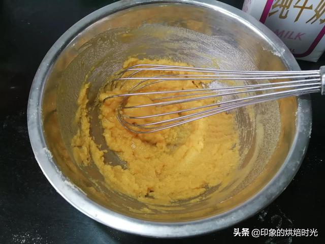 1.盆里倒入40g牛奶,25g糖,40g油,充分搅拌至均匀一致的乳白色,然后筛入60g玉米面粉,z字型搅拌均匀。