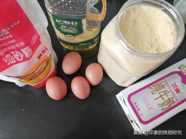 烫面玉米面戚风蛋糕配方:玉米粉85克,鸡蛋5个,玉米油50克,牛奶60克,细砂糖50克,柠檬汁或白醋几滴