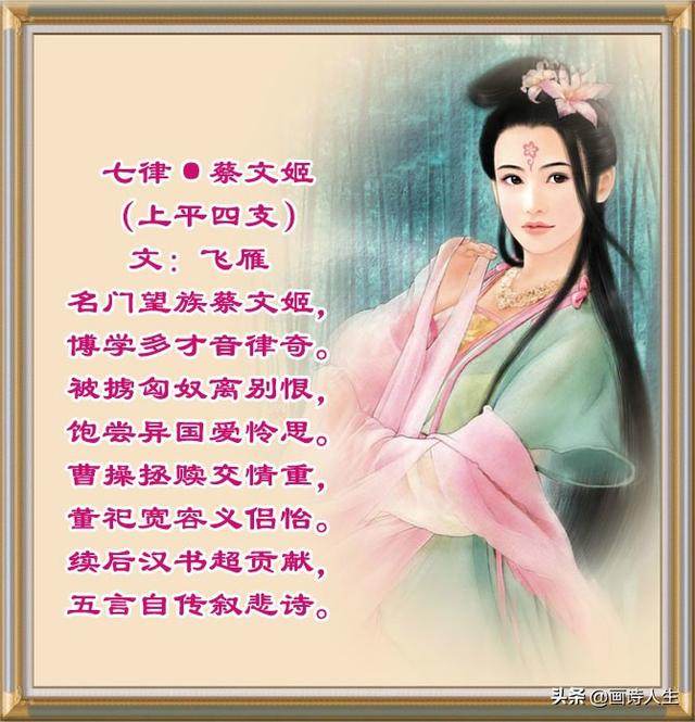 一代才女,三嫁人妻,饱经风霜。为思念远在匈奴的两个儿子,作了一首《胡笳十八拍》。可谓是拍拍凄凉,断人肝肠。有兴趣的朋友可以去查来看看,真的很感人!