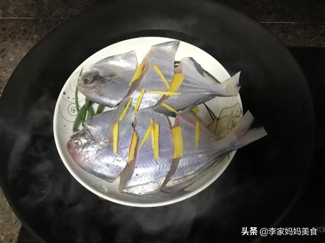 4,蒸锅大火上大气后,放入鲳鱼,加盖,保持大火蒸6分钟;