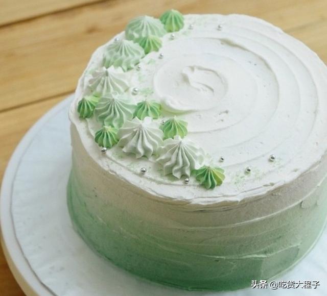 15.用绿色色素混合淡奶油,由下至上,由深至浅的再挤上一次奶油,表面也要挤上一次白色的奶油