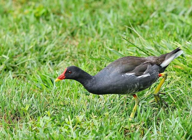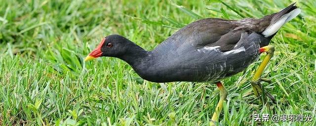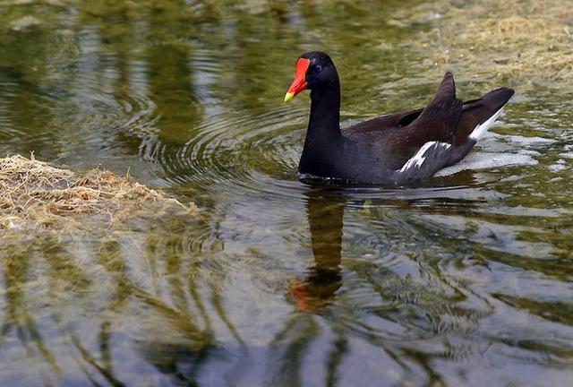 黑水鸡(学名:Gallinula chloropus):是鹤形目、秧鸡科的鸟类,共有12个亚种。中型涉禽,体长24-35厘米。嘴长度适中,鼻孔狭长;头具额甲,后缘圆钝;嘴和额甲色彩鲜艳。翅圆形,第2枚初级飞羽最长,或第2枚和第3枚初级飞羽等长,第1枚约与第5枚或第6枚等长。尾下覆羽白色。趾很长,中趾不连爪约与跗蹠等长。趾具狭窄的直缘膜或蹼。通体黑褐色,嘴黄色,嘴基与额甲红色,两胁具宽阔的白色纵纹,尾下覆羽两侧亦为白色,中间黑色,黑白分明,甚为醒目。脚黄绿色,脚上部有一鲜红色环带,亦甚醒目。游泳时身体露出水面较高,尾向上翘,露出尾后两团白斑很远即能看见。