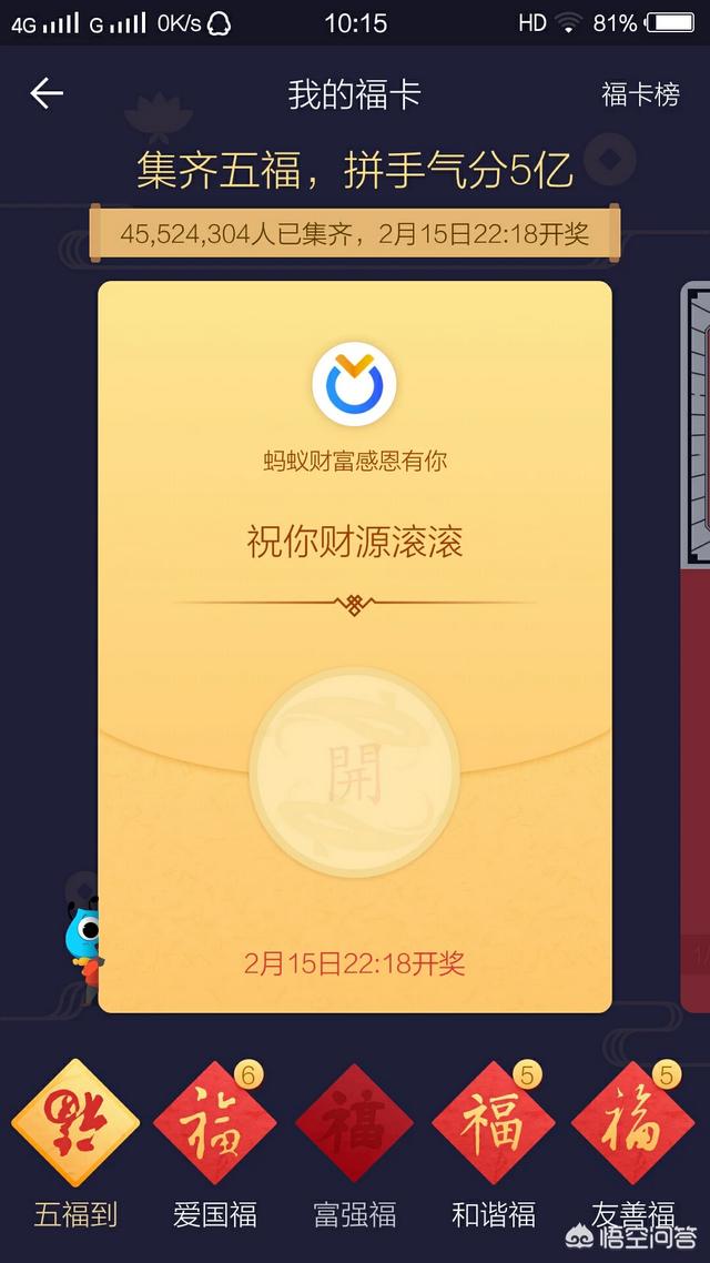 今年的集五福玩法和去年有所不同,凡是在除夕之前集够的用户都有机会赢取一个现金红包,少的一两块钱,多的可是666元,在除夕晚上十点十八分准时开奖,开奖之后没有齐集五福的人支付宝也会送上。而且集五福的难度也降低很多,不再只有靠加支付宝好友才能获得福卡,大家可以不用再努力的想方设法加支付宝好友,还可以从其他两个几乎没有任何门槛的方向集够五福。